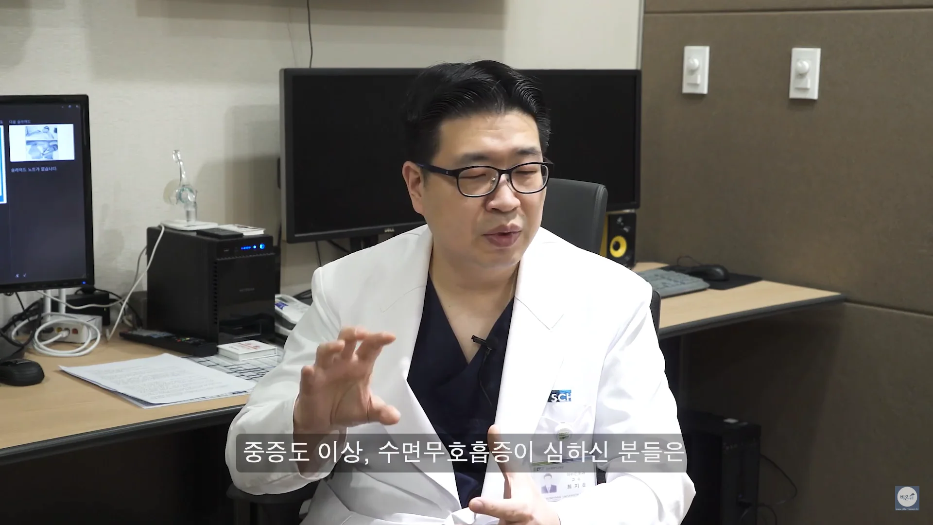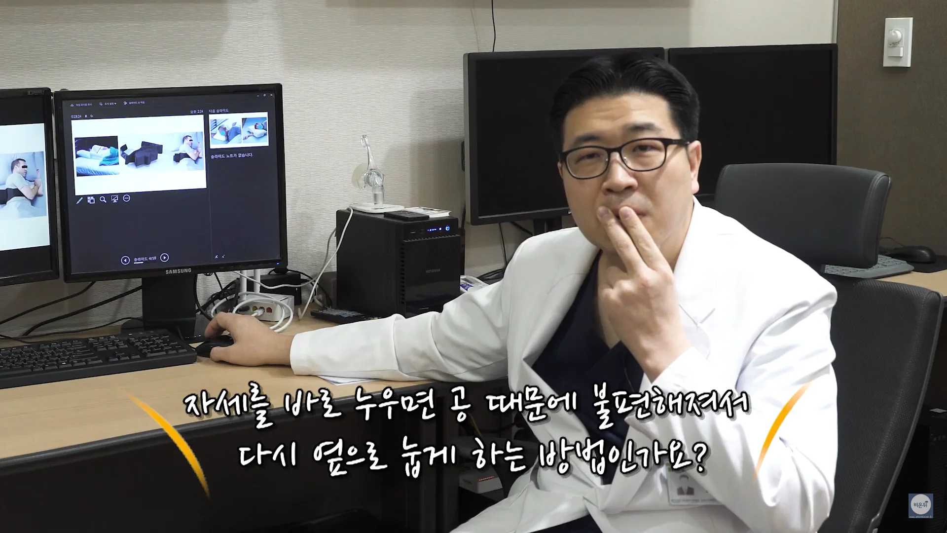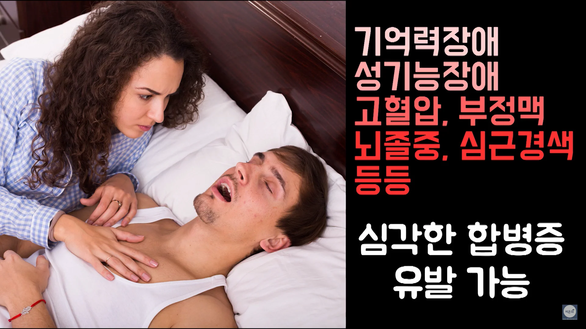 수면 중 일시적으로 호흡이 멈추는 수면무호흡 증상은 흔히 볼 수 있는 증상이지만 사실은 위험한 질병입니다. 기억력장애, 성기능장애, 고혈압, 부정맥, 뇌졸중, 심근경색 등 심각한 합병증을 유발할 가능성이 있습니다. 치료 방법으로는 적정체중을 유지하고 금주와 금연을 하는 것입니다. 그리고 수면 자세를 교정하는 방법이 있는데요, 누울 때 옆으로 누우면 중력의 방향때문에 구조상 공간이 넓어져 무호흡증에 도움이 됩니다.