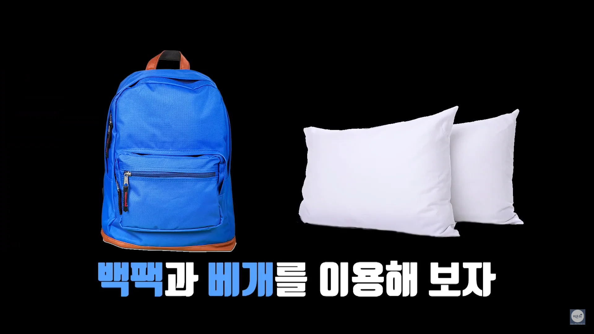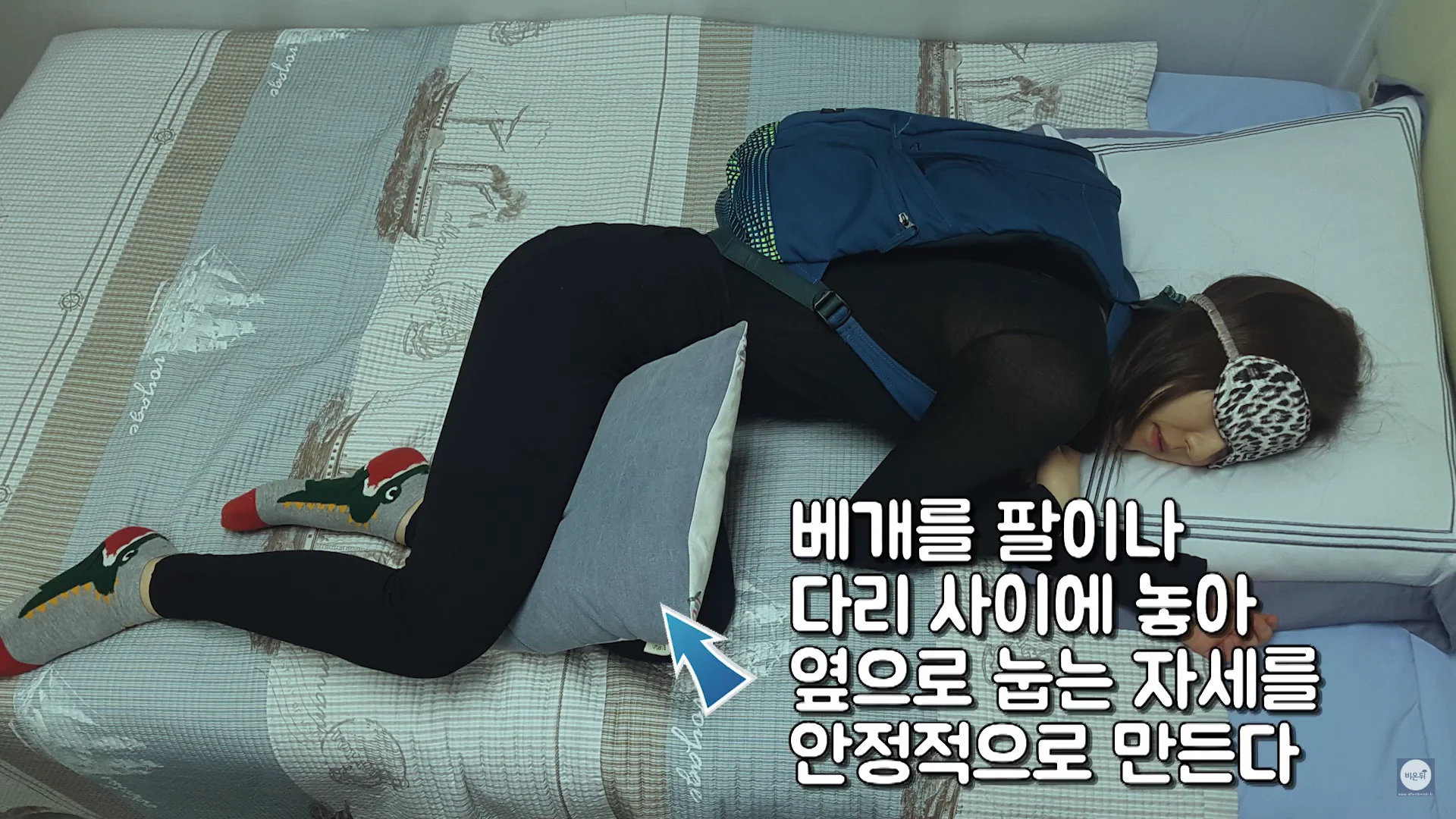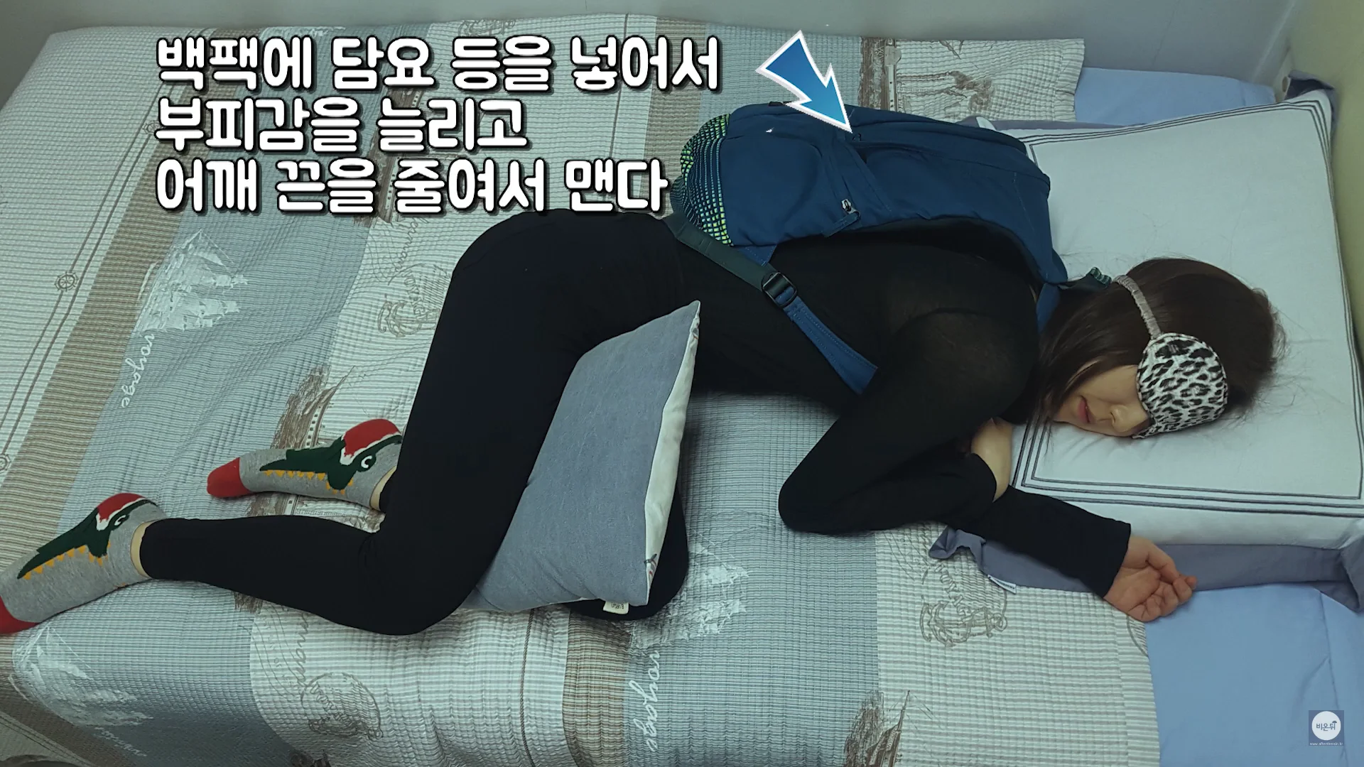 백팩에 담요 등을 채워넣어 부피감을 늘리고 어깨끈을 줄여서 맵니다. 그렇게 한다면 바로 누울 걱정 없이 옆으로 눕게 됩니다.
