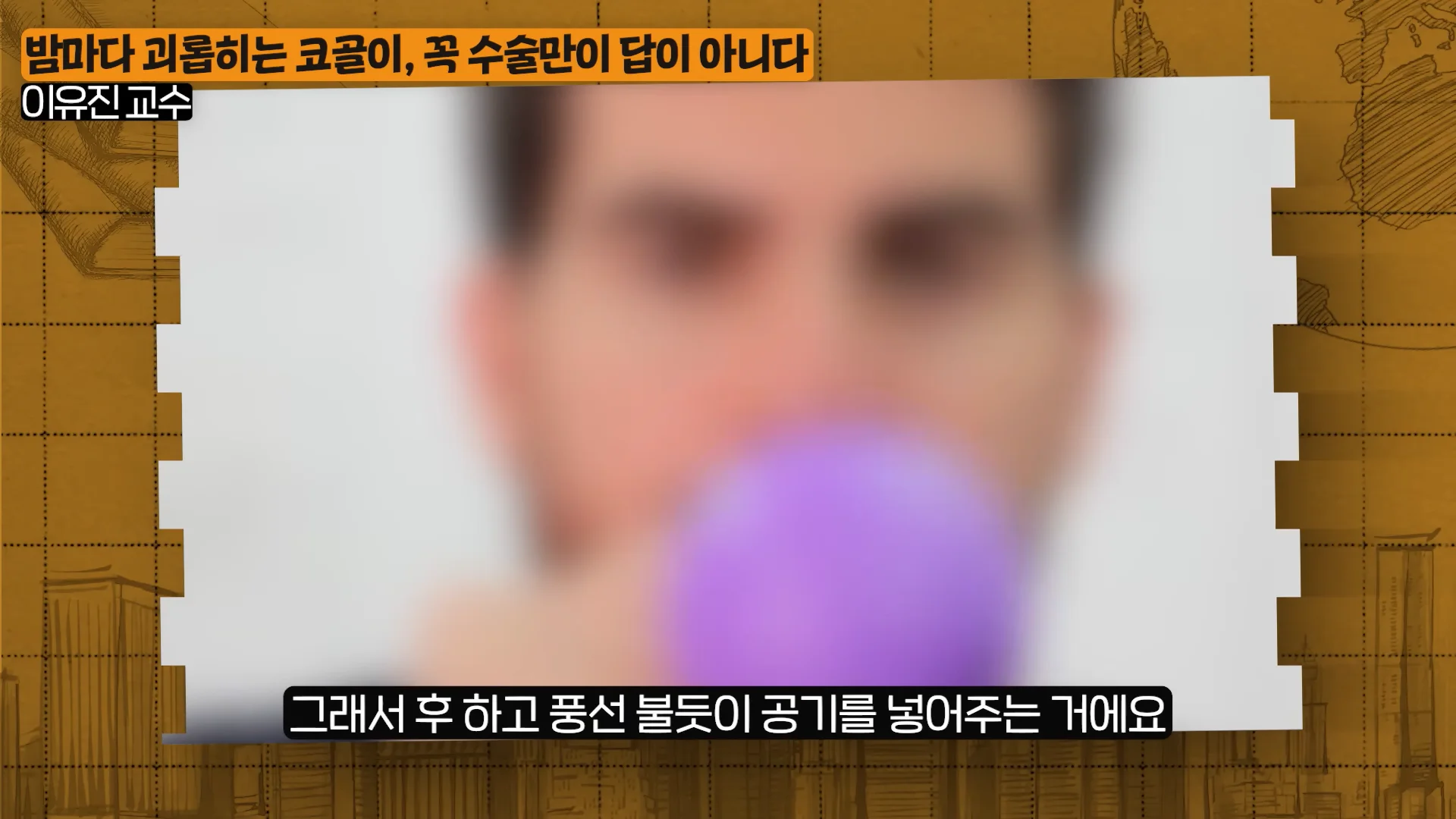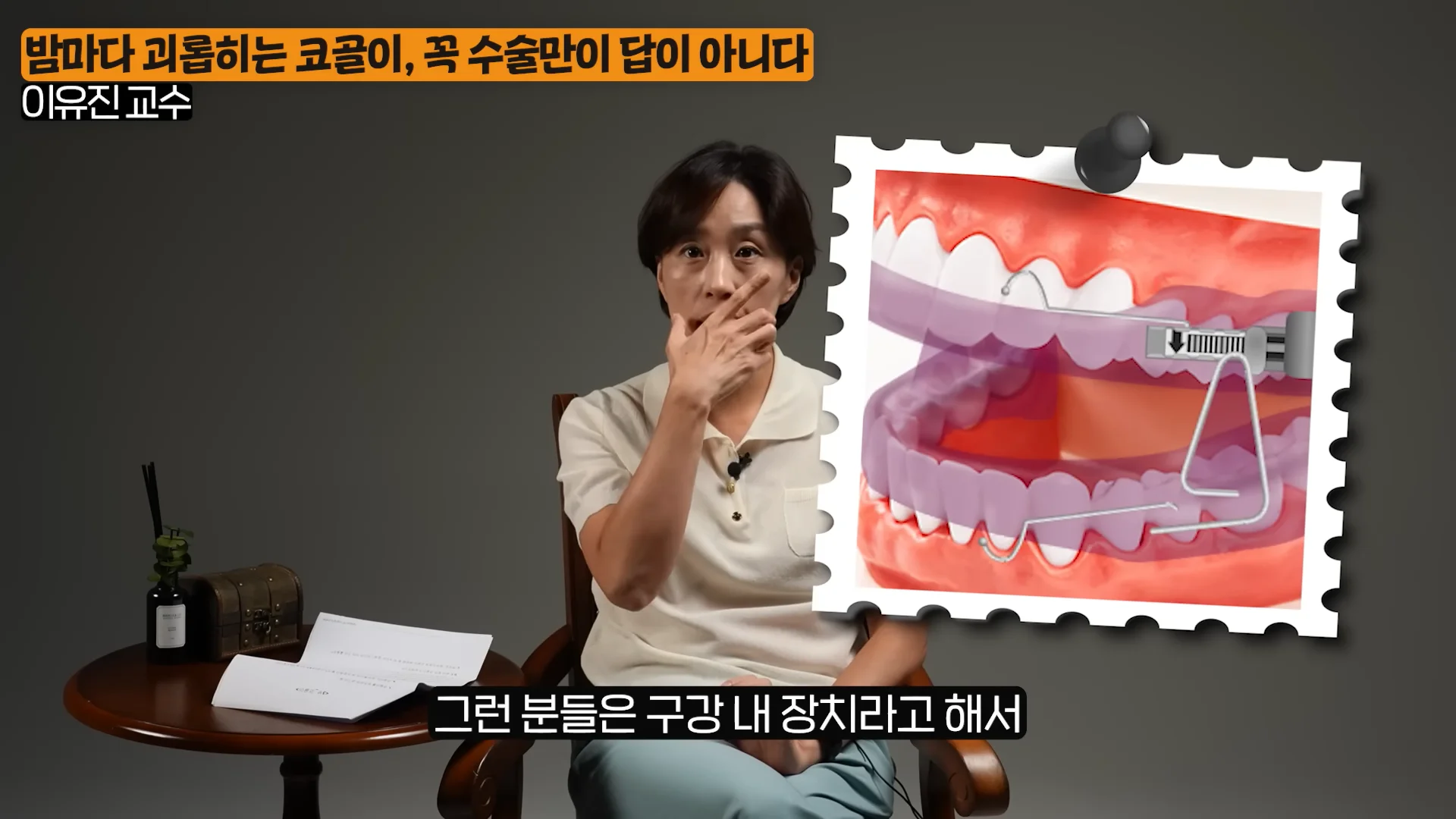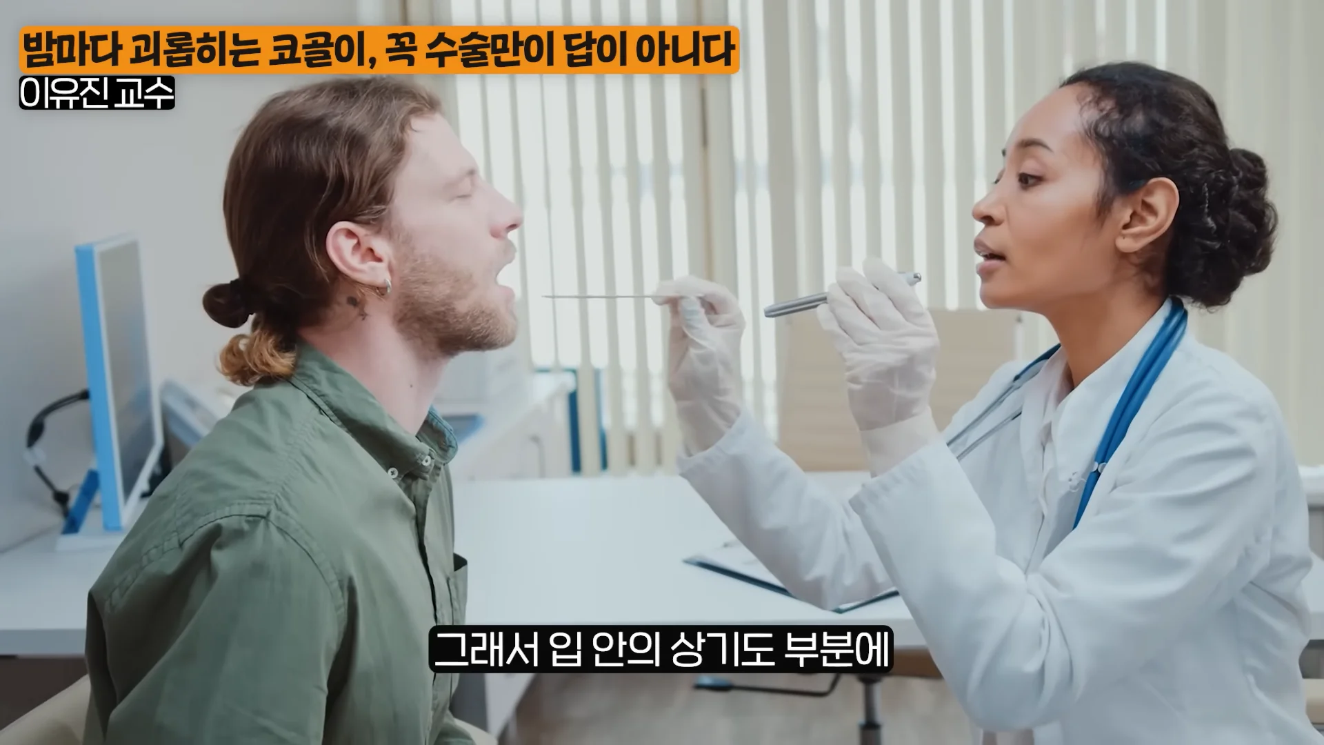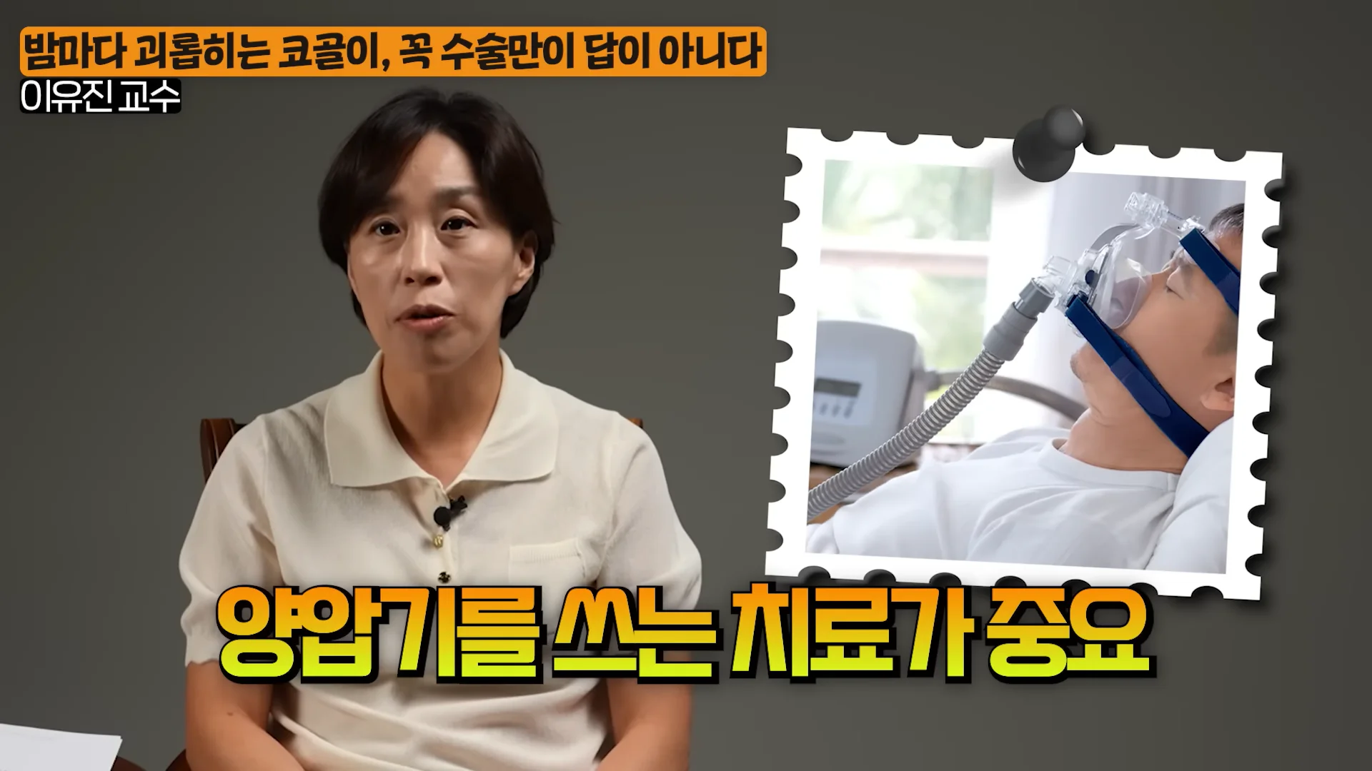 코골이 치료를 위해서는 이비인후과에서 입안 상기도 부분을 넓혀주는 수술을 하기도 합니다. 또는 양압기 치료가 있는데요, 이 양압기 치료는 좁은 상기도 내에 풍선을 불듯이 바람을 불어 넣어 치료하는 방법입니다. 이 방법이 가장 중요합니다. 혹은 이 양압기 치료가 불편한 분들을 위해 턱, 혀를 앞으로 당겨주는 구강 내 장치를 하기도 합니다.